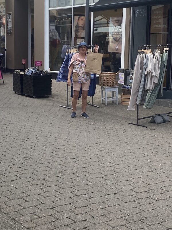Turen var ikke en rundtur, så det var lidt sejt at gå tilbage til byen efter 2 1/2 times vandring langs vandet. Vi valgte at gå den direkte rute langs en ikke så spændende vej, men nåede så frem til centrum og gågaden. Her slog vi os ned på cafe Gerrits og fik noget at styrke os på. Henning blev anbragt med en øl, men jeg smuttede tilbage til den butik, hvor jeg havde spottet “et godt tilbud” – en flot hørkjole til halv pris…