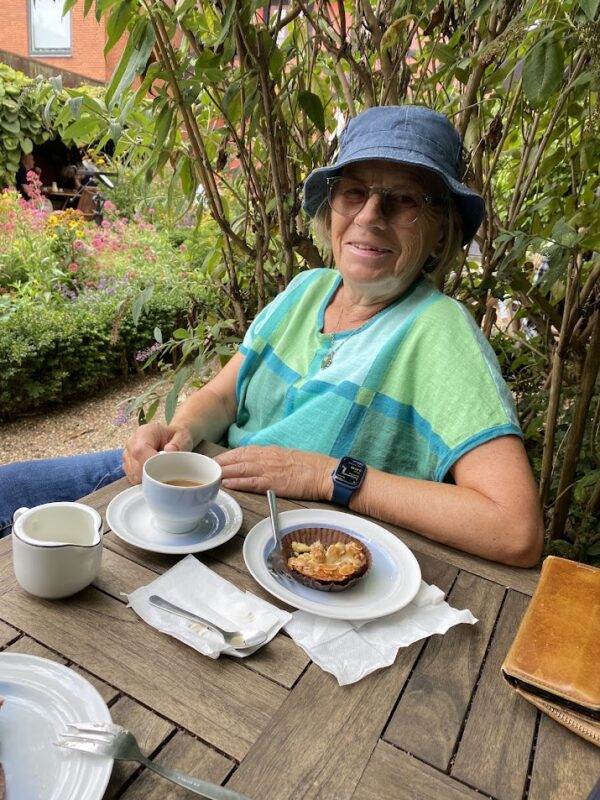 Fandt et enkelte ledigt bord i den meget fine og hyggelige blomsterhave, hvor vi fik kaffe og kage til 110 kr for 2. Rigtigt fint at sidde der.