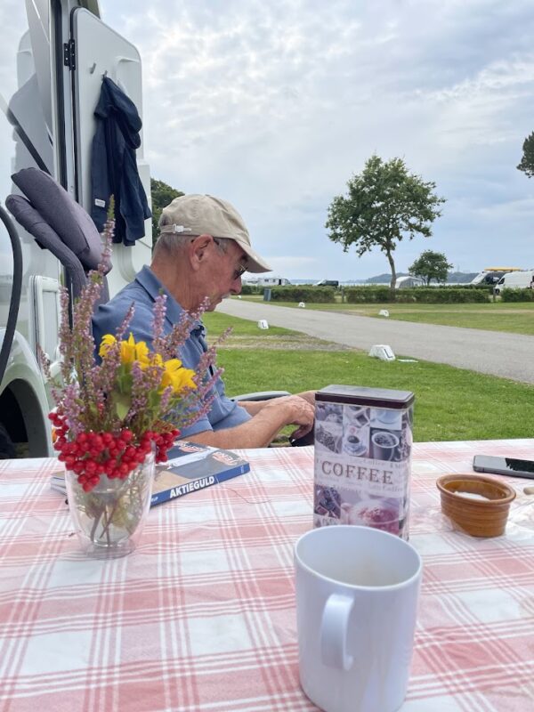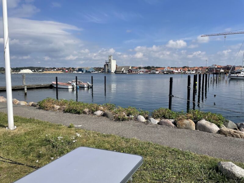 Morgenmad ude i solen med udsigt over vandet. Kørte ind til Svendborg og parkerede på den helt nye, men lidet spændende autocamperplads i udkanten af byen.
