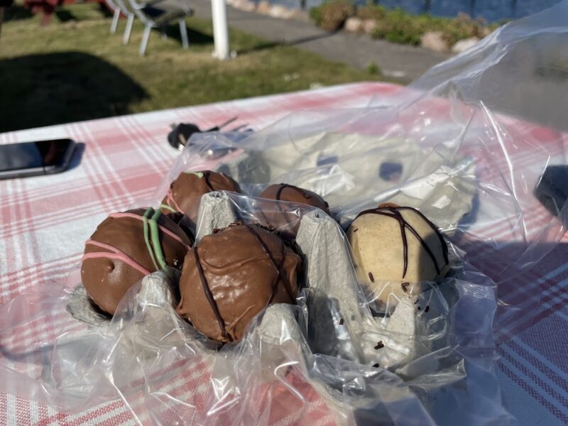 På vej videre til næste stop i Assens måtte vi lige forbi Baks bageri i Middelfart for at købe en bakke af deres berømte romkugler. Der er sandelig nogen, der lever højt på den ide med luksusromkugler.