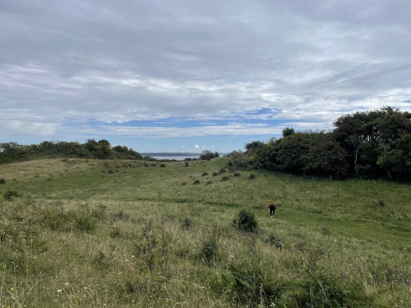 Nu gik turen til Helnæs, hvor vi parkede efter dæmningen og gik turen ved Bobakkerne og Djævlebakken. Vendte dog om undervejs og gik samme vej tilbage, da der var mange køer i indhegningen, og vi skulle lige forbi dem. De så nu aldeles fredelige ud, men alligevel.