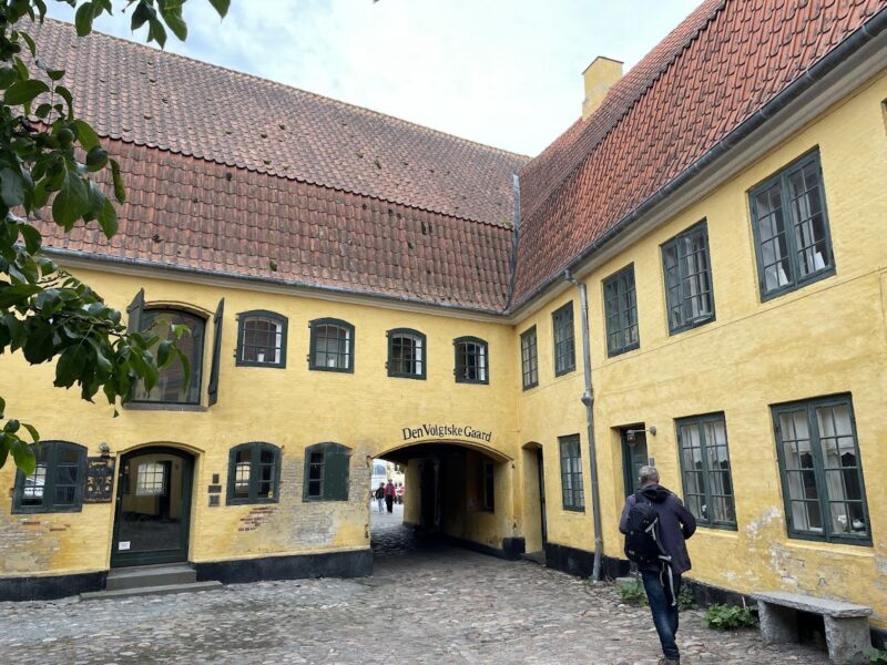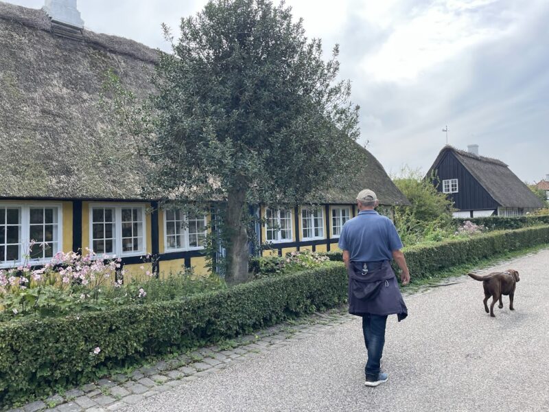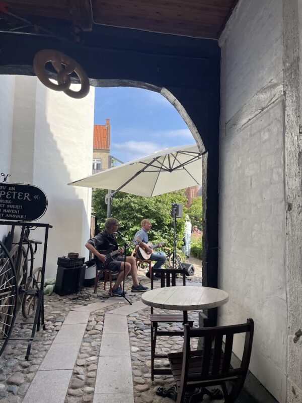 Vi gik langs vandet ind til byen og havde Nanna med. Ind ad hovedgaden og ved Farvergården (der hører under museet) så vi to spillemænd, der spillede i haven.