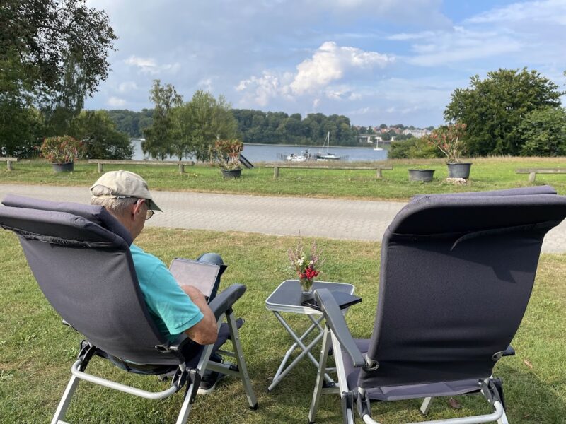 På vores allerførste campertur i 2021 boede vi på Assens Marina, og den gode oplevelse ville vi gerne gentage. Selvom vi ankom godt middagstid, var der godt fyldt op.