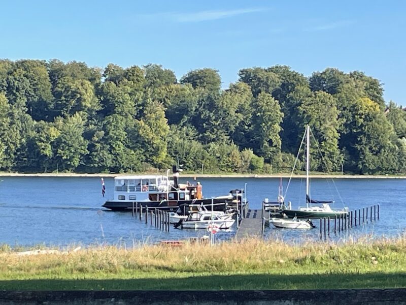 Kunne sidde ude og spise, da det var stille og lunt. Ved vandet lige neden for os var broen, hvor M/S Helge lægger til. Kunne også være fint at tage en sejltur med denne båd engang.