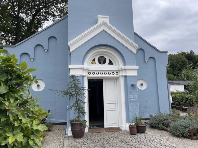Da vejret fortsat var dejligt om aftenen, hvor vi cyklede ind til byen igen for at spise på Resumé, blev kjolen passende luftet. Restauranten ligger i en tidligere kirke, der er malet lyseblå og derfor hedder Den blå kirke.