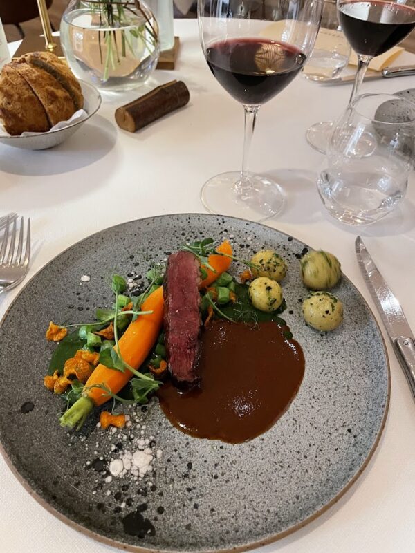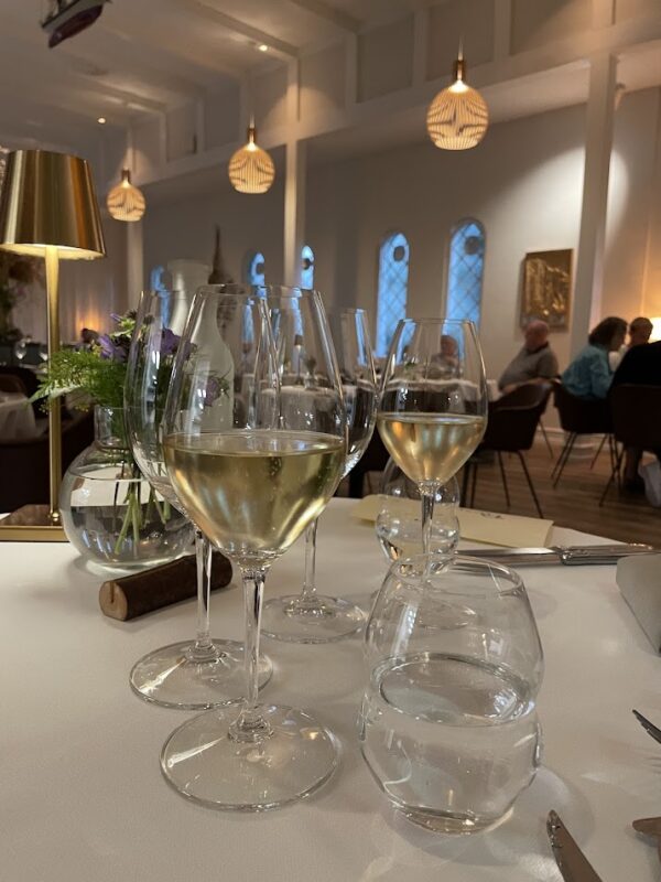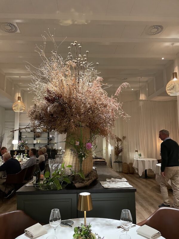 Særdeles kreative appetizere og fine retter. Til vores skuffelse var hovedretten “sommerand” – annonceret på nettet og på menukortet udenfor – erstattet af kalvespidsbryst. Nok skriver vi september og efteråret er formelt begyndt, men vi havde sat næsen op efter anden. “Martin Brygmann” skridtede straks ud i køkkenet og kom tilbage med et : “de kan godt finde lidt and til jer”. Stor var jublen og selvom vi kun fik et enkelt stykke, smagte det super. Gråand – lidt vildtagtigt i det. Måske blev oplevelsen ødelagt en smule af, at jeg på vej retur fra toilettet kunne konstatere, at der også var and på bordet mindst to andre steder…Anyway, en dejlig oplevelse.