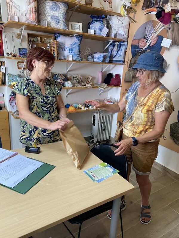Der var nogle fine billeder, lavet af tørrede blomster. Ikke ret dyre, mellem 35 og 60 euro. Der var også en udstilling af en gammel skolestue, men bag glas. Og et rum med lokalt husflid. Jeg faldt for en lille strikket trøje i lysebrune, råhvide og lyseblå farver plus et par tilsvarende strikkede futter til. De kostede 6, trøjen, 19,50 euro.