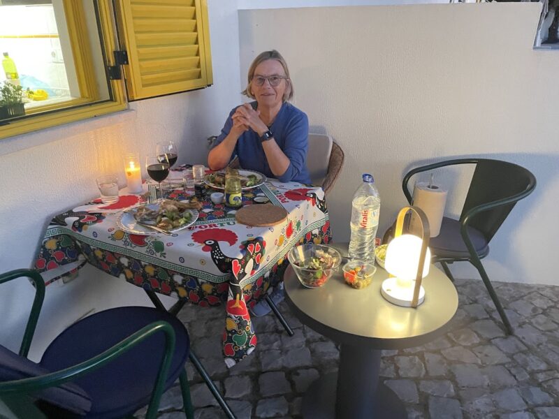 Om aftenen spiste vi på Bomhuset, Casa de .Barreira. Det var ren Lady og Vagabonden. Vi sad ude på fortovet, sammen med få andre og fik den berømte bruchetta med gedeost og figen, plus en lækker salat med feta og nødder.