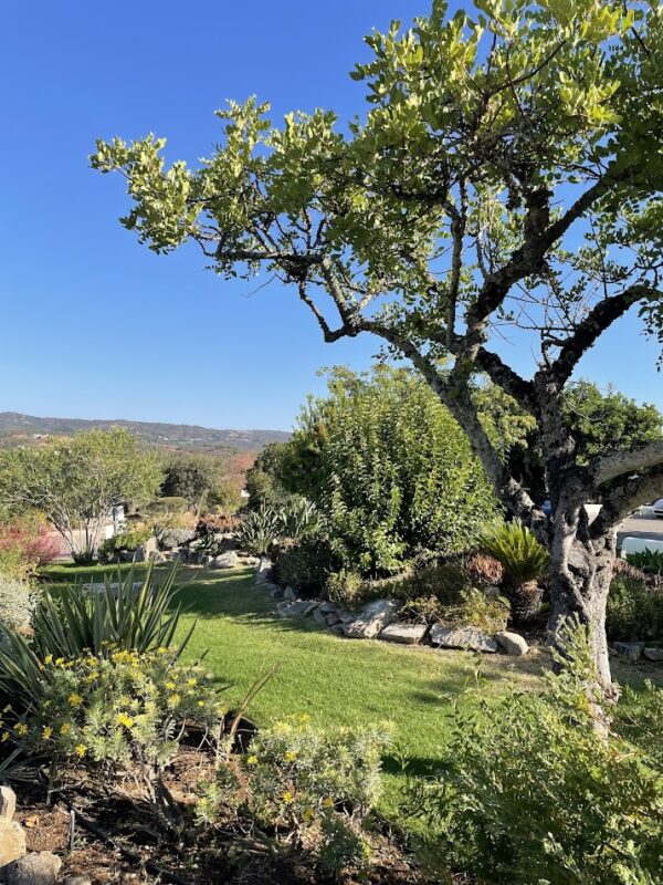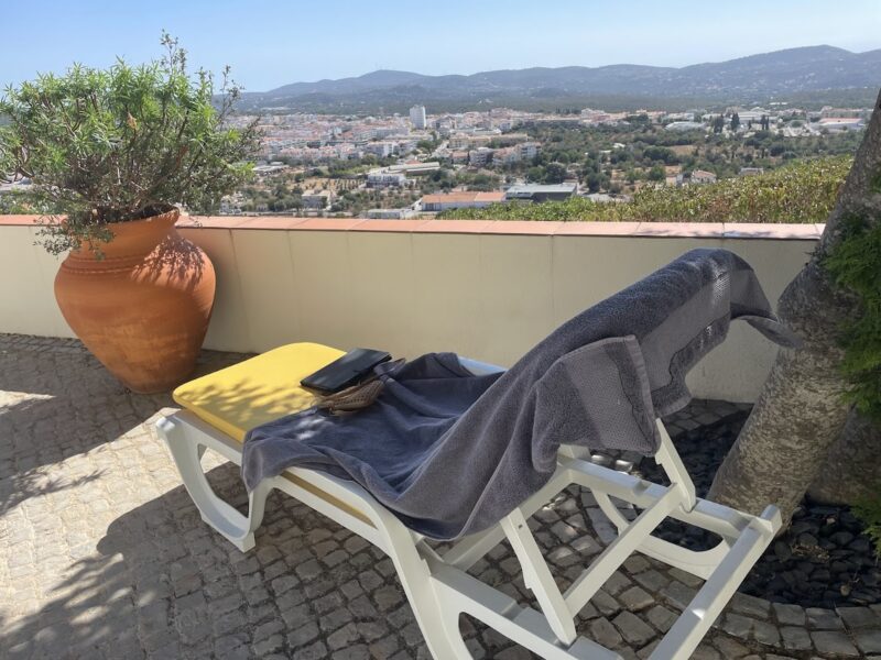 Fra denne dag fik jeg indført et fast eftermiddagsritual: 20 baner i poolen, efterfulgt af læsning under træet på terrassen neden for poolen. Her er perfekt – skygge og udsigt. At ligge i solen siger mig ikke noget.