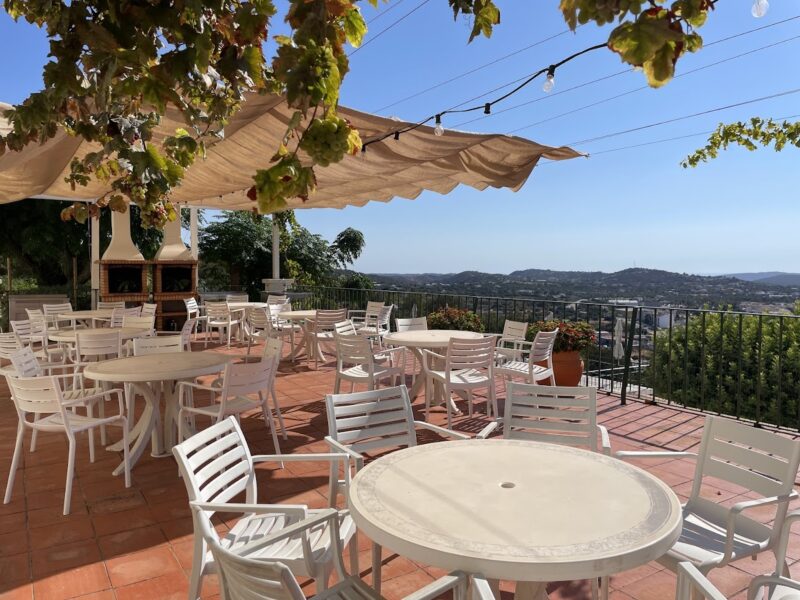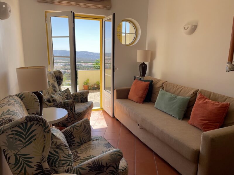 Det var første gang vi skulle bo i sidebygningen, der i mine øjne især er super, når vejret er varmt, som det var på denne tur. Fra vestterrassen er der fin udsigt til det grønne, herunder lidt op mod bjergene. Men den flotte udsigt ned mod pool og by, som man har fra sydsiden, mangler selvfølgelig.