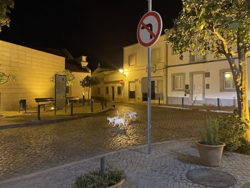 Pludselig kom en procession af byens husdyr gående: først to næsten ens brogede hunde, fulgt af 3 helt ens, kridhvide katte. De fem havde øjensynligt aftalt en fælles aftentur og fulgtes ad videre gennem byen. Et sjovt syn.