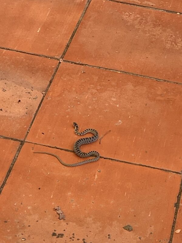 Coracao er et rent paradis, men en enkelt slange er der dog…Det forlød dog, at denne fætter er en Hesteskosnog og dermed ufarlig. Den mente dog, den lige skulle vise sig frem, da vi viste Coracao frem for vores gæst…