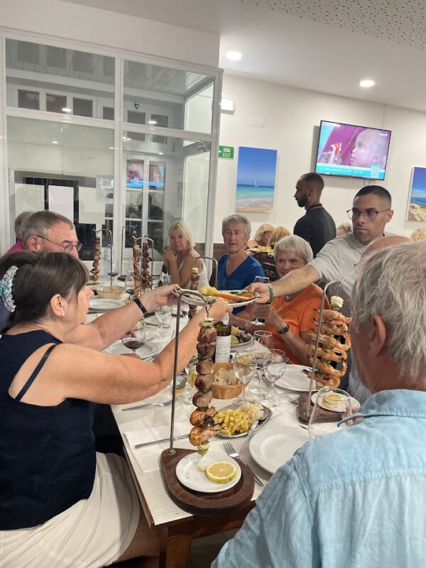 Ned til restauranten, der nu var godt i gang. Kl var kun 12:30, men dels skulle vi helst vente på højvande, dels var der måske ikke plads senere. Så vi fik de samme fiskespyd som sidst, som havde vakt så stor begejstring.