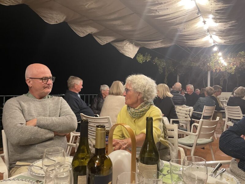 Én spillede guitar og vi sang gode, gamle kendinge fra vores yngre dage. Der var ingen foredrag, og det var helt fint, for snakken gik super og vi havde hyggelige bordfæller. Tænker heller ikke de udendørs rammer passer så godt til foredrag.