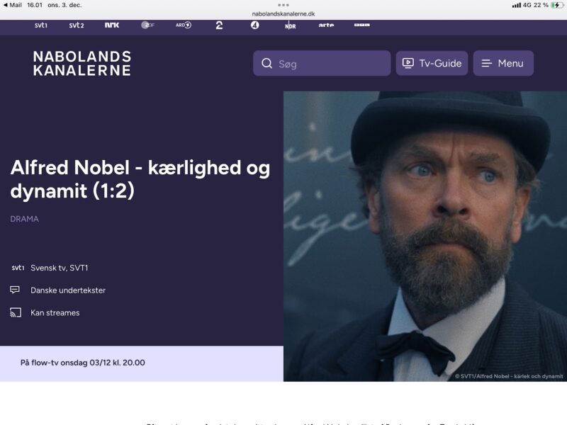 Da vi forlod Stockholm, kunne jeg læse, at der samme aften startede en serie på SVT1, netop om Alfred Nobel, herunder ikke mindst om hans privatliv. Desværre kan vi ikke se den, det er megaærgerligt. Vi havde før Yousee, men er desværre gået over til Tellmore, det skulle vi aldrig have gjort…