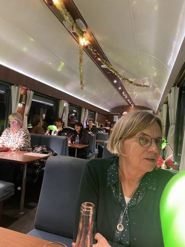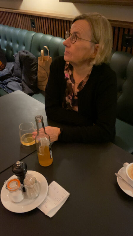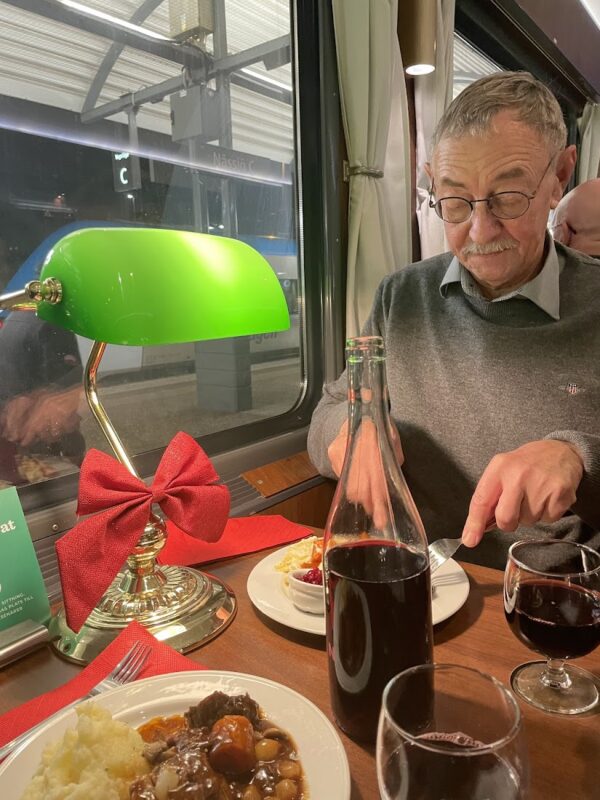 På et tidspunkt kom en herre og skulle sidde ved samme bord som os. Det er også formelt 4 mandsborde, men bedst, hvis man er 4 i samme selskab. Jeg synes derfor først, det var lidt træls, men så faldt vi i snak og det var super. Vores medpassager var en journalist i 50erne, hvis far havde været en belæst bibliotekar, der havde haft massevis af bøger. Manden boede i Stockholm og arbejdede freelance, også som fotograf, og havde besøgt sin 97 årige mor nede i Sydsverige. Han forstod dansk, mere end de fleste svenskere, men var jo heller ikke helt grøn. Jeg talte også langsomt og tydeligt. Vores erfaring er absolut, at danskere er bedre til at forstå svensk end omvendt. Og er der tale om unge mennesker, kan man lige så godt tale engelsk fra starter, de forstår ikke en meter af det, vi siger.