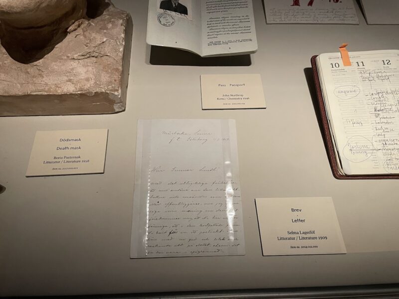 Nobelprismuseet er ret nyt, fra 2001, og med et lidt pudsigt koncept. Dels er der bannere med portrætter af alle Nobelprismodtagere, der kører rundt i loftet. Dels skal alle prisdeltagere aflevere en genstand , der har relation til det, de har modtaget prisen for. Så udstillingen, der ikke er så stor, viser alt fra kuglepenne og bøger til større og mere specielle genstande. Der er selvfølgelig også information om de enkelte prismodtagere, men det er ikke det mest fremtrædende.