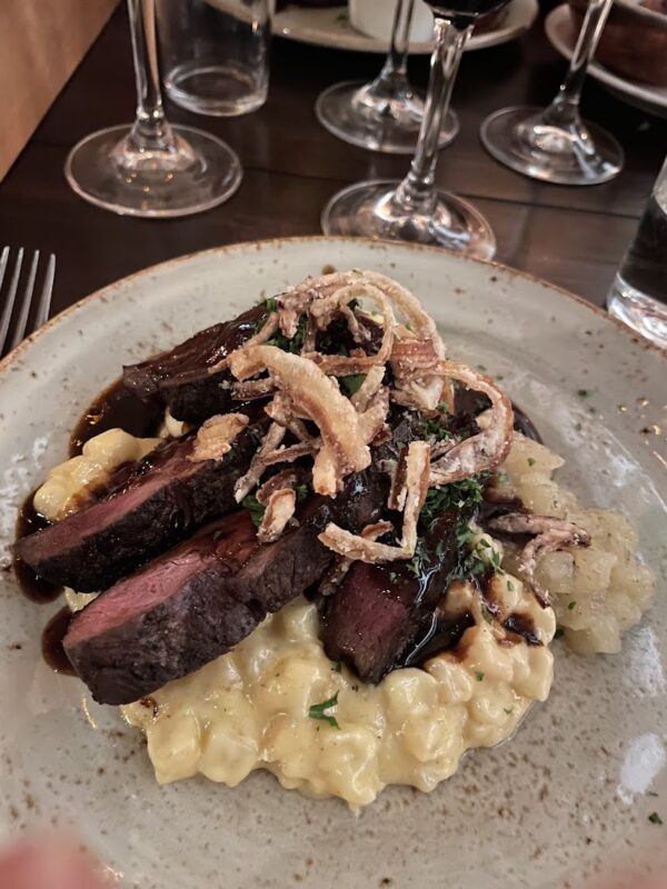 Vi fik meget lækker jordskokkesuppe og jeg fik super mør rensdyr-roastbeef på kartoffelmos. Venlig betjening og et lille hyggeligt sted.