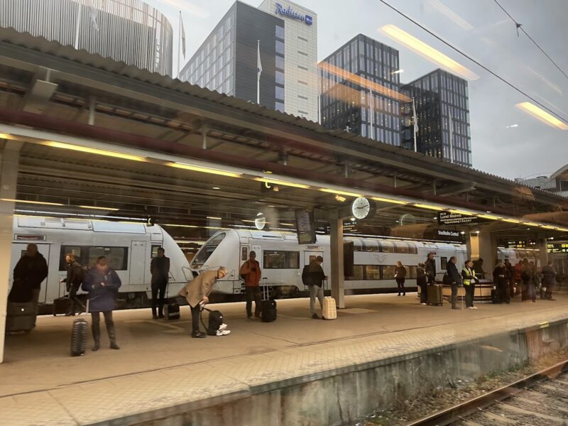 Vi havde i receptionen bestilt en taxa til kl 8,30. Havde hørt meget om pirattaxaer i Stockholm og ville være sikre på, vi ikke havnede i en sådan. Lidt nervepirrende at skulle nå Snälltåget, der kun afgår kl 9.13, dels fordi taxaen var lidt forsinket, dels fordi der var en voldsom trafik. Vi nåede dog frem i god tid og det var nemt at finde perronen.