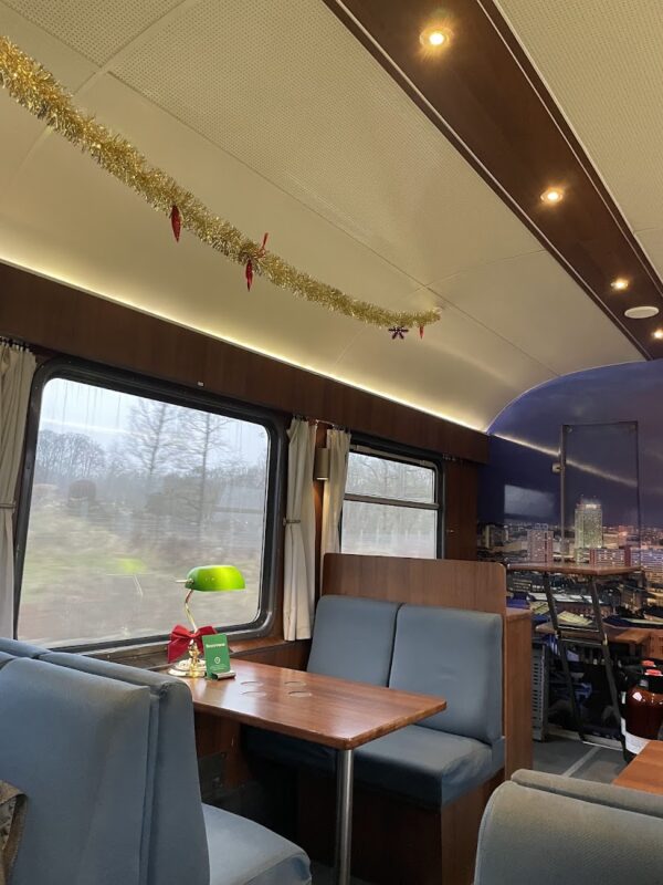 Det sjoveste var ubetinget spisevognen, hvor det var godt, vi havde booket bord. Maden var billig og slet ikke dårlig.